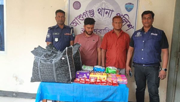 ১৪/০৪/২০২৬ খ্রি. ভোর ০৪.৩০ ঘটিকায় আশুগঞ্জ থানা পুলিশের একটি টিম গোপন সংবাদের ভিত্তিতে অভিযান পরিচালনা করে। এসময় পুলিশ অত্র থানাধীন টোলপ্লাজা এলাকা হতে ০১টি প্রাইভেটকার আটক করে। প্রাইভেটকারটি তল্লাশী করে শুল্ক ফাঁকি দিয়ে অবৈধ পন্থায় আনা ভারতীয় বিভিন্ন ব্যান্ডের ক) Nestle Kitkat 4 fingers ১১০০ (এক হাজার একশত) পিস চকলেট,খ) Softer Bar- ৪০০ (চারশত) পিস চকলেট, গ) Dairy Milk Choclate ৪৮০ (চারশত আশি) পিস চকলেট,ঘ) Snickers -৭২০ (সাতশত বিশ) পিস চকলেট, ঙ) BENZO বিভিন্ন রংয়ের ১৮ টি প্যাকেটে প্রতি প্যাকেটে ৬৬ পিস করে, মোট ১১৮৮ (এক হাজার একশত আটাশি) পিস চকলেট, চ) MENTOS ১৮ প্যাকেট চকলেট, প্রতি প্যাকেটে ৩০ পিস করিয়া মোট ৫৪০ (পাঁচশত চল্লিশ) পিস চকলেটসহ সর্বমোট ৪৪২৮ (চার হাজার চারশত আটাশ) পিস ভারতীয় চকলেট উদ্ধারসহ ০২ জন চোরাকারবারীকে গ্রেফতার করা হয়। পুলিশ উদ্ধারকৃত মালামাল বিধি মোতাবেক জব্দ তালিকা মূলে জব্দ করে।